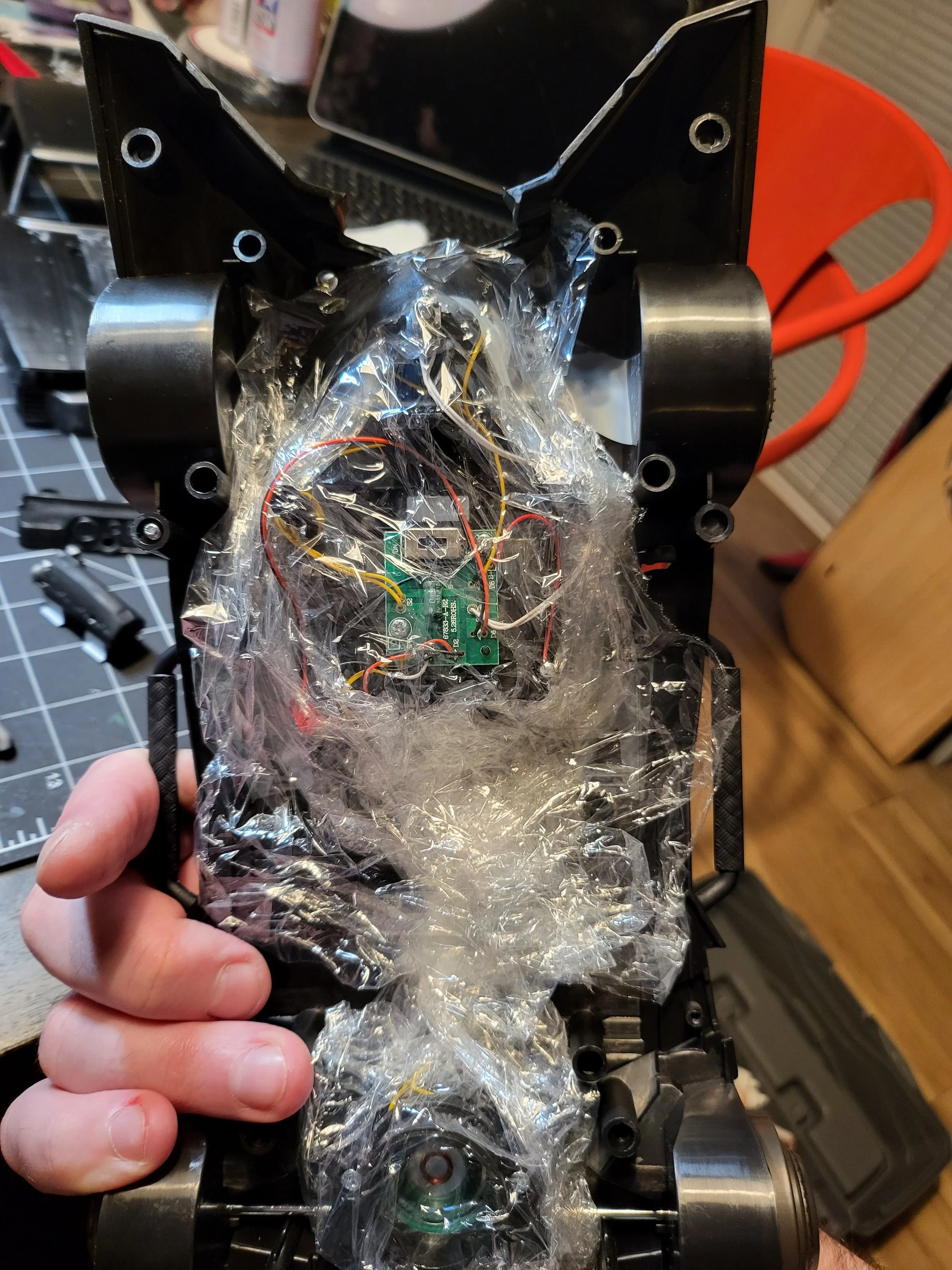 I didn’t want to remove the electronics since they were glued in and had some solder that seemed delicate. In order to spray the rear body I wrapped the electronics in saran (plastic) wrap with scotch tape. That way I was able to spray the body, paint the details and then clear coat without risking the integrity of the electronics.